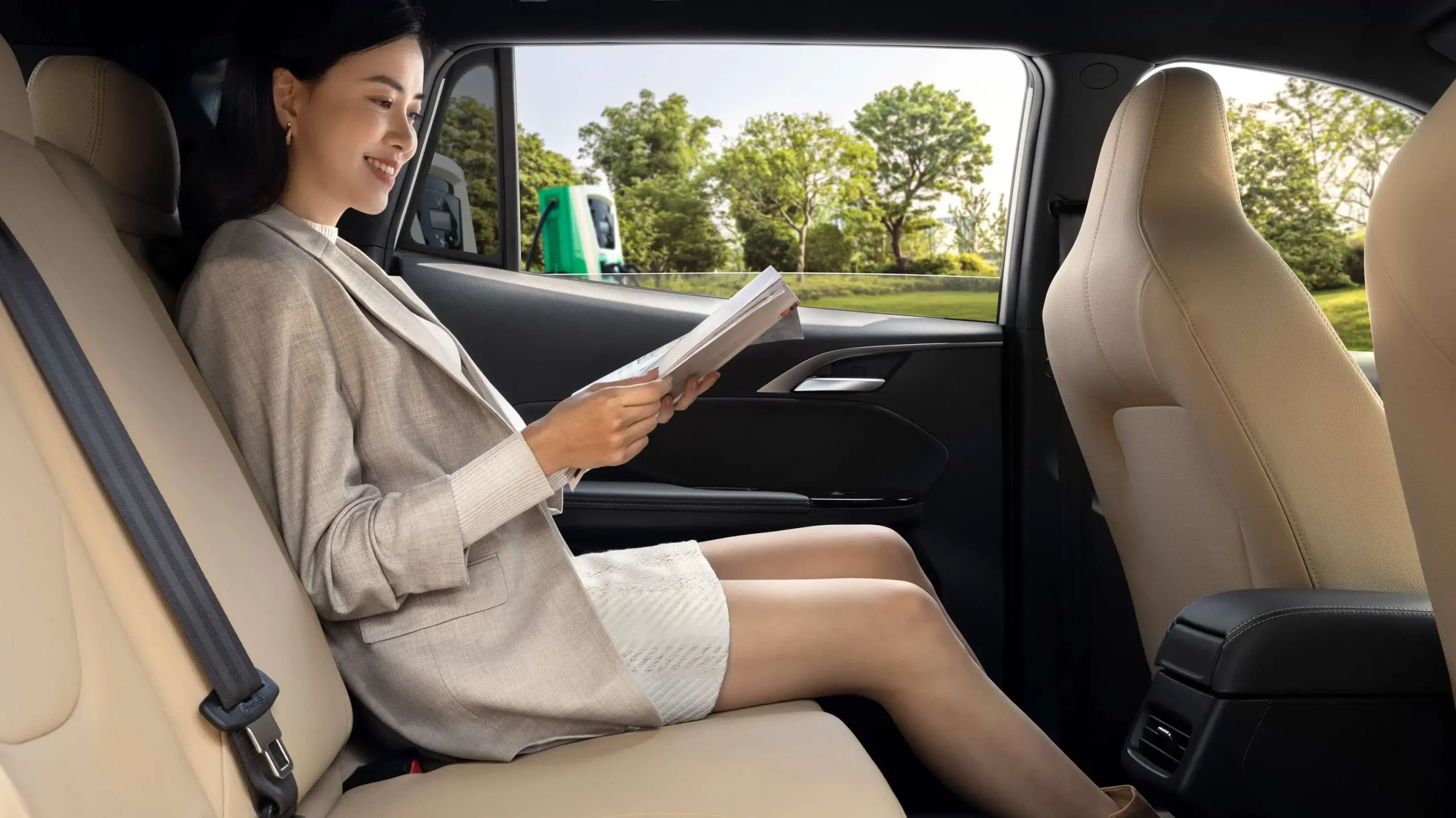 Không gian thoáng đãng nhờ động cơ điện và hệ thống pin tinh giản đặt dưới sàn xe, đảm bảo sự thoải mái cho hành khách trên xe.